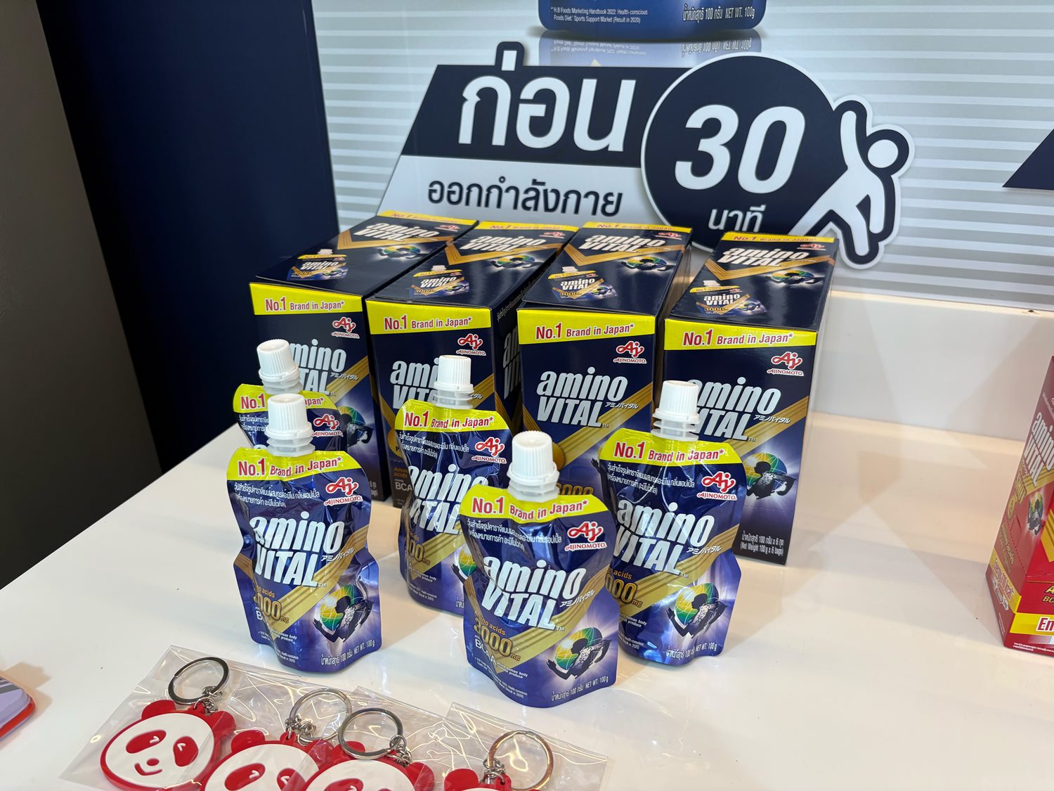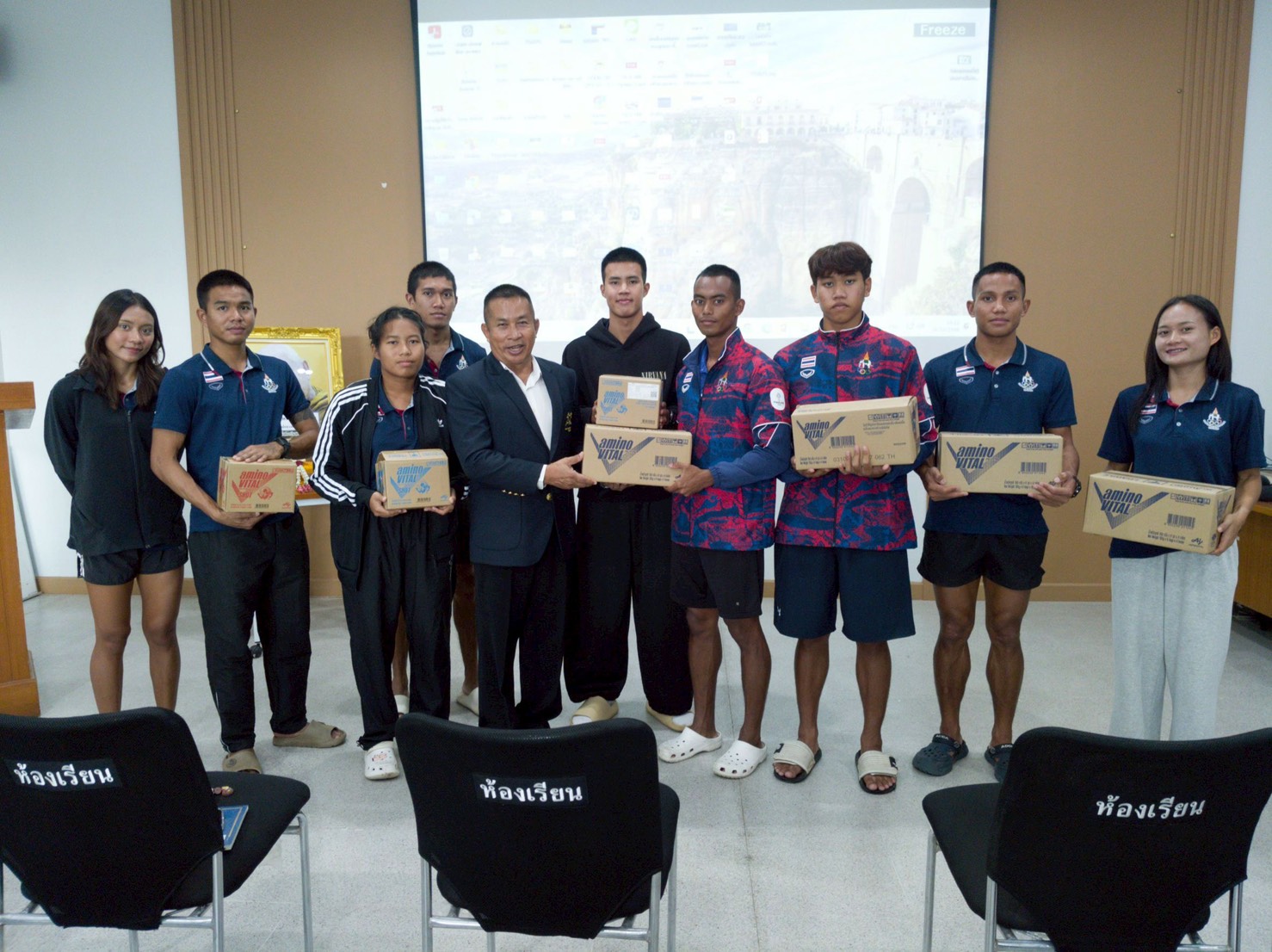( เครื่องหมายการค้า อะมิโนไวทัล ) Amino vital no. 1 Brand in Japan จากบริษัทที่เป็นทางการสนับสนุนนักกีฬาเตรียมโครงการที่ กกท. และบริษัท Ajinomoto ด้านอาหารเสริม ร่วมมือกันอย่างเป็นทางการ และมีความปลอดภัยเพื่อนักกีฬาเตรียมซีเกมส์ จำนวน 10 กล่องใหญ่ ที่ทางสมาคมฯ ได้มีหนังสือขอรับการสนับสนุนผงเครื่องดื่มและเจล อาหารเสริมจากศูนย์วิทยาศาสตร์การกีฬา การกีฬาแห่งประเทศไทย และได้รับมาเป็นที่เรียบร้อย ส่งมอบให้กับนักกีฬาเตรียมโครงการซีเกมส์เพื่อบำรุงร่างกาย และเสริมสุขภาพให้มีกำลังและสมรรถภาพที่ดี ต่อไป