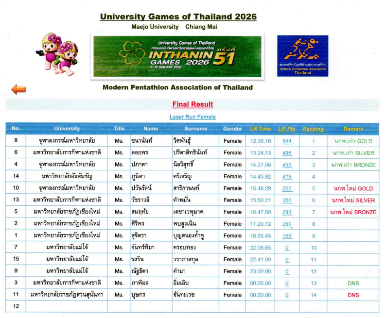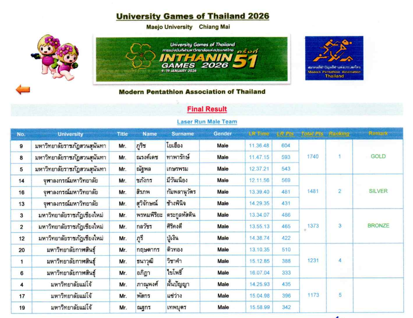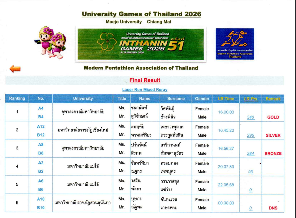 ผลการแข่งขันการสาธิตการแข่งขันกีฬาปัญจกีฬามหาวิทยาลัยแห่งประเทศไทย (Inthanon games 2026) ครั้งที่ 51 เมื่อวันอาทิตย์ที่ 18 มกราคม 2569
