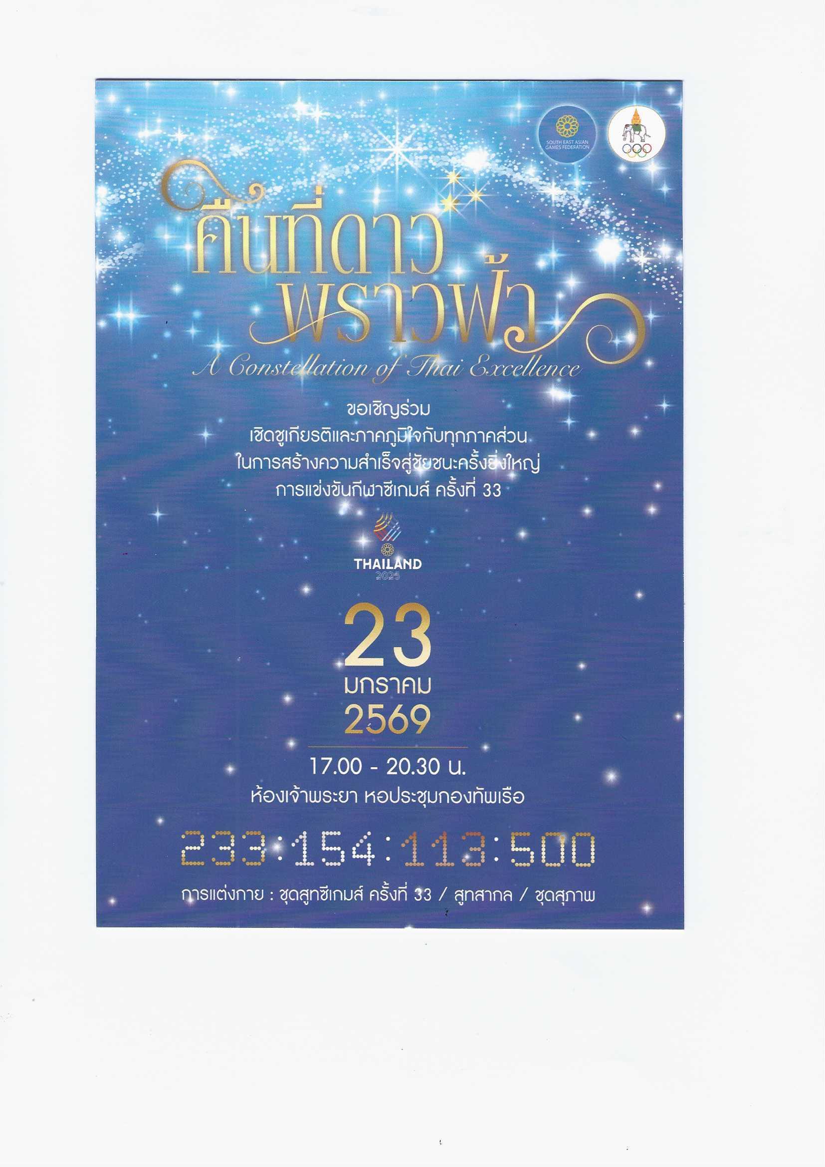 ที่ผ่านมา เข้าร่วมงาน คืนที่ดาวพราวฟ้า ( Constellation of Thai Excellence ) งานเชิดชูเกียรติ และภาคภูมิใจกับทุกภาคส่วน ในการสร้างความสำเร็จสู่ชัยชนะครั้งยิ่งใหญ่ การแข่งขันนกีฬาซีเกมส์ครั้งที่ 33 ที่ประเทศไทยเป็นเจ้าภาพ ที่ห้อง เจ้าพระยา หอประชุมกองทัพเรือ ระหว่างเวลา 17.00 – 20.30 น.