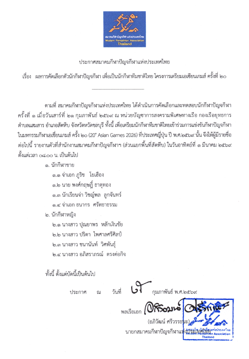 ผลการคัดเลือกตัวนักกีฬาปัญจกีฬาเพื่อเป็นนักกีฬาทีมชาติไทย โครงการเตรียมเอเชี่ยนเกมส์ครั้งที่ 20 ที่ประเทศญี่ปุ่น ปี 2569 ให้ผู้ืั้มีรายชื่อ รายงานตัวที่สำนักงานสมาคมกีฬาปัญจกีฬาฯ (ส่วนแยกพื้นที่สัตหีบ) ในวันอาทิตย์ที่ 1 มีนาคม 2569 ตั้งแต่เวลา 08.00 น. เป็นต้นไป